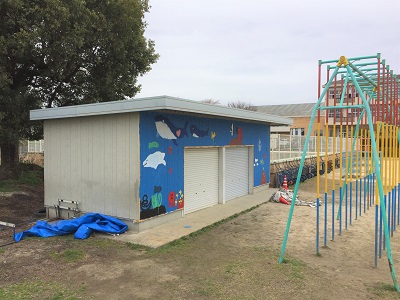 これまで、無機質な体育倉庫でしたが、子どもたちの手により温かい雰囲気になりました。