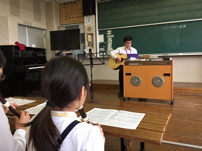 授業の最後に今月の歌を、校長先生のピアノ伴奏に合わせて(ギターもコラボして)歌いました。