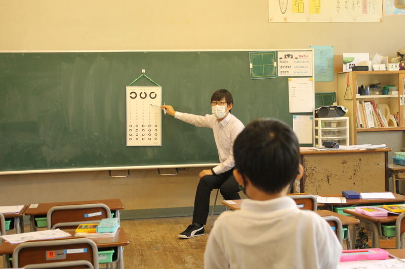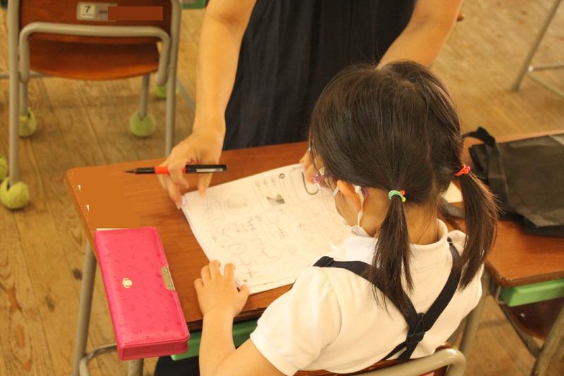 子どもたちには休校中に学校より学習課題が出されています。登校日にはそれらの課題に対して、担任が点検サポートをしています。写真は、1年生が家庭で学習したひらがなについて、担任が子どもたちの頑張りに朱で丸をつけている様子です。