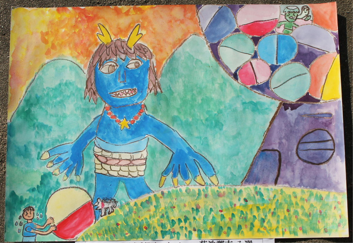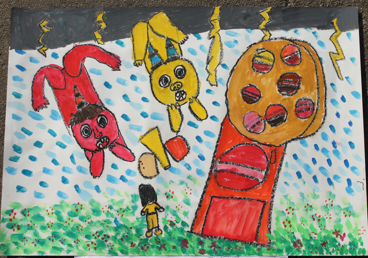 くふうしたところは、山や空の色をかえたところです。ガチャガチャの中に、カッパが入っちゃってたましいがぬけるところをかきました。