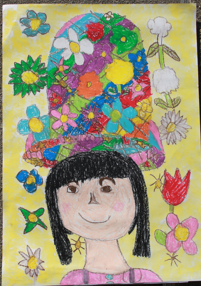 この絵は、わたしのすきなぼうしです。たくさんの花に、にじがあたっているぼうしをかきました。こんなぼうしがあるとかぶってみたいと思いました。