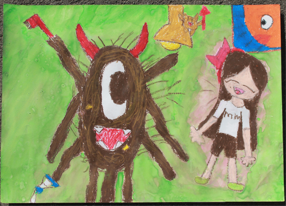 わたしは、びっくりモンスターがおふろから出てきてお話をしているところをかきました。モンスターのとくちょうは目です。なぜなら、はみがきをするとき、はのうらや小さいよごれがよくみがけるからです。あと、モンスターの手をよく見てほしいです。なぜなら、モンスターの手にハミガキセットをもっているからです。わたしもいつかびっくりモンスターに会ってみたいです。