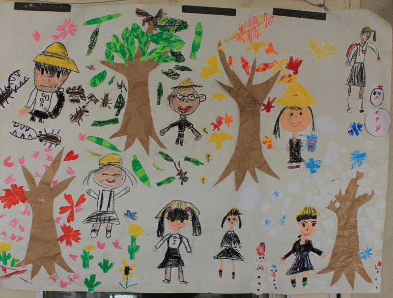 学校の様子を広用紙に文や絵で表して、新1年生が入学するのを待っています。