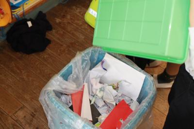 今回紹介するのは、1年生の様子です。机のプラスチック製の引き出しは、一年間でかなり汚れます。そこで、新しい学年を迎える前に、ゴミを出したり、引き出しをぞうきんで拭いたりして、身の回りをきれいにします。