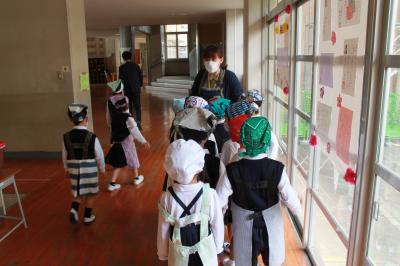 保健室、給食室、職員室などを探検できました。行ったところで保健室や用務の先生にお話を聞くことができました。