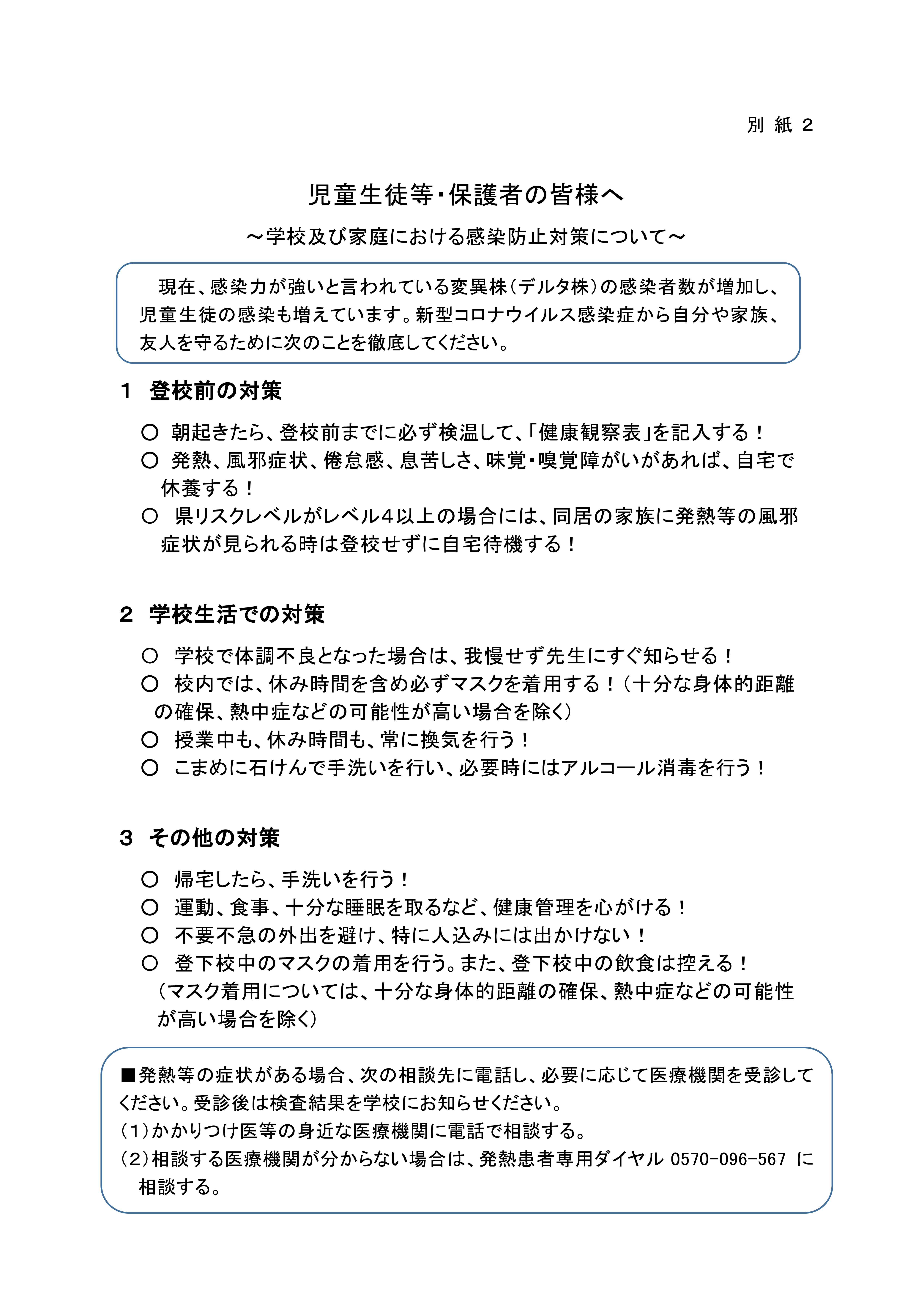現在、感染力が強いと言われている変異株(デルタ株)の感染者数が増加し、児童生徒の感染も増えています。