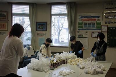 切り餅としるこ缶も、阿南母親部長と富永副部長が親子で袋詰めをしてくださいました。