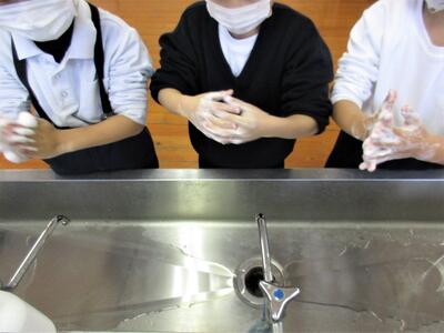 給食前の廊下からは「あわあわ手洗いのうた」を歌いながら楽しく手を洗う子どもたちの声が聞こえてきていました。