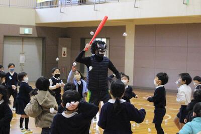 なんと本物の鬼が登場!しかし、臆することなく豆を投げる子どもたち。1年生のあまりの勢いに鬼も早足で退散していきました。