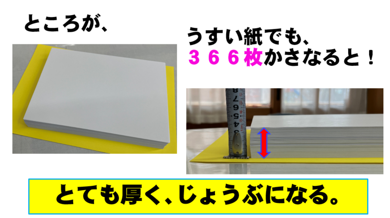 うすい1枚の紙でも、366枚重なると、とても厚くて丈夫になります。このように、1日の成果は見えにくくても、366日毎日コツコツと努力を重ねることで力が確実に身に付きます。