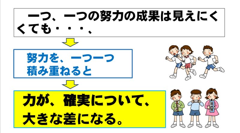 オンラインで行われたにこにこ集会では、校長先生から“「粘り強く」取り組むことの大切さ”についてお話がありました。