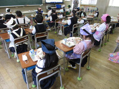 小学生になってから初めての給食です。子ども達は、「どんな給食が出るんだろう~!」と、わくわくしていました。各学級で、給食当番についてや準備の仕方等を一つ一つ確認しました。そして、みんなで元気よく「いただきます!」をした後、もりもりと食べていました。片付けの時には、「全部食べ終わったよ~」「食べられるところまで食べました!」と嬉しそうに話していました。また、苦手なものにも挑戦して一口食べようとする姿があり感心しました。