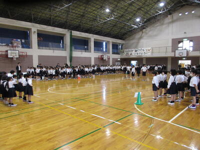 集会委員会の子どもたちを中心に計画、進行を行いました。まず1年生が入場すると、2年生から6年生が温かい拍手で迎え入れました。そして、集会委員会の児童が歓迎の言葉を伝えました。そのあと、全校児童で「♪誰だってお誕生日」を歌いました。お誕生日の月を言われた人は、「はーい!」と立ち上がります。1年生は、自分と同じ月のお誕生日の人を見つけて嬉しそうにしていました。次に、落ちた落ちたゲームをしました。「りんごが落ちた」「雷が落ちた」「500円玉が落ちた」の、それぞれのかけ声に合わせて、決まったポーズをするというゲームです。とても盛り上がりました。