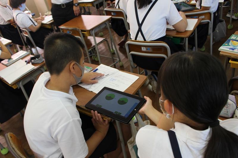 9月9日(水)、德渕教諭による算数科の授業研究会を行いました。6年3組の子供たちが興味を抱きながら、集中して取り組む姿が印象的でした。特に、タブレットを使って円を等積変形するシミュレーションを確認する場面では、「おぉ~」と声が上がり、(参観している私たちも同様(^^)おぉ~!と心の声を上げました)今どきのツールの便利さ!以前は、色紙や画用紙をチョキチョキ切り、視覚的に示していたとか。教材教具も進化したもんです。また、タブレットをスマートに使いこなす子供たちも、さすが今どき。ものすごい時代になりました。