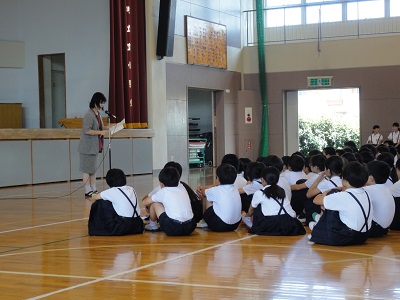 22日(金)に童話発表会を行い、各学級の代表が、低学年・中学年・高学年に分かれて発表しました。
