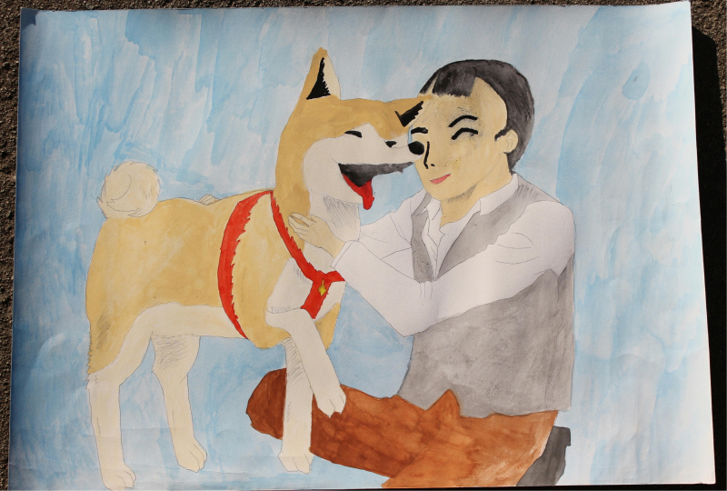 私は、ハチが上野先生がなくなってからも、毎日渋谷駅に通い続けたところに感動しました。そして、二人が笑顔で再会するところが心に残ったので絵にもそれが伝わるように、抱き合って喜ぶ二人の様子を描きました。その他にもハチの毛の色を工夫したり、背景を二人が目立つように工夫したりしました。この物語を読んで、人も動物も言葉は通じないけれども心は通じ合えると思いました。