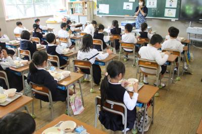 4月14日(水)、1年生が初めての給食でした。みんな給食を楽しみにしていたようで,前日から「明日の給食、楽しみー。」と話してくれました。