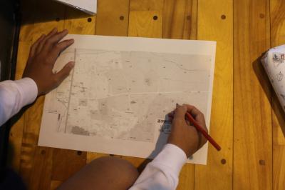 分団こばと会の班のメンバーの確認、通学路の確認、集合場所と集合時間の確認、危険箇所、避難場所の確認などを保護者と子供たちが話し合いました。