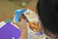 直線を切るのが上手になったら、三角や四角、カーブ切りに挑戦します。はさみの刃はまっすぐなので角度があるものやカーブを切るには、紙を動かさなければなりません。はさみを使いながら紙を動かすのは1年生にとってとても難しいので、ゆっくり切ることを指導します。