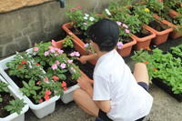 学校を花いっぱいにするために、梅雨の晴れ間に花の苗をプランターに植えをしました。