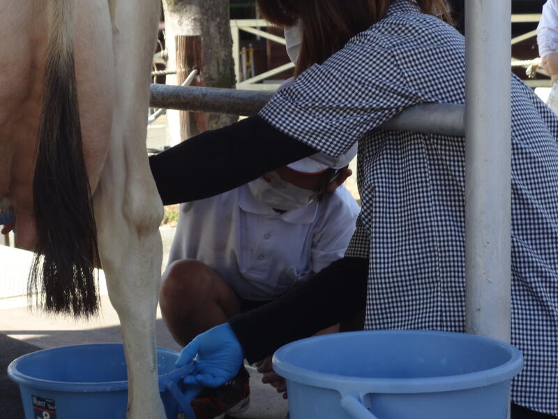 乳搾り体験では「温かい!」「やわらかい!」「たくさん出た!」とたくさん感想を述べていました。