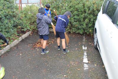 12月中旬より、昼休みに、3年男子がボランティア清掃を行っています。集めても集めても減らない落ち葉を集めて、清掃をしてくれています。