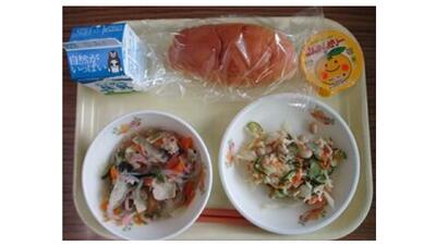 「ふるさとくまさんデー」では、熊本県内の各地域の特産品を使ったメニューが毎月給食で出されます。今年度最初の4月は「熊本市」で、メニューはミルクパン、牛乳、タイピーエン、大豆のサラダ、ばんかんゼリーでした。