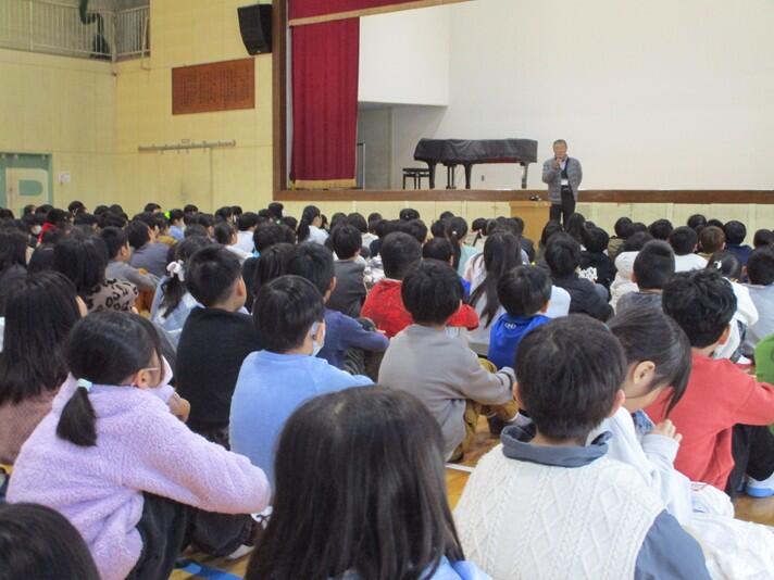 2月12日(木)に、宇城市教育長であり、大津高校サッカー部の総監督でもある平岡和徳先生をお迎えして、5・6年生に「年中夢(む)求(きゅう)~24時間をデザインする~」という演題でご講話をいただきました。