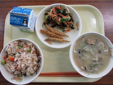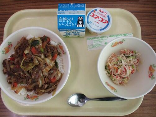 「ふるさとくまさんデー」では、熊本県内の各地域の特産品を使ったメニューが毎月給食で出されます。今年度最後の3月は「阿蘇地区」で、メニューは、焼き肉どんぶり、切干大根サラダ、ヨーグルト、牛乳でした。