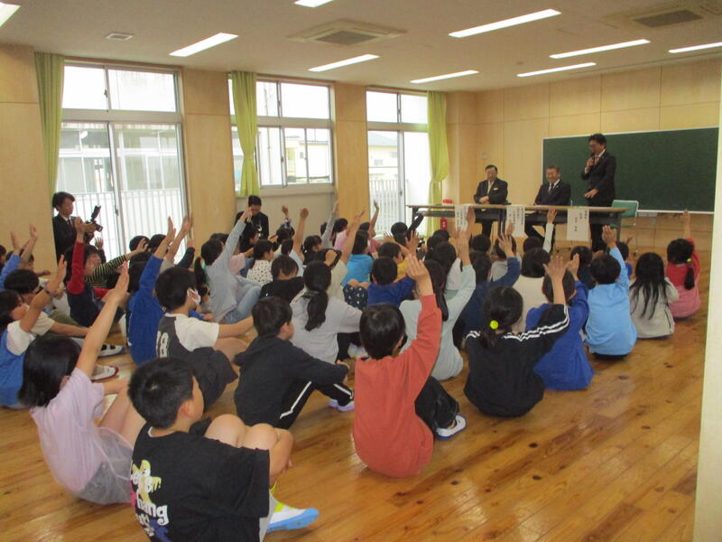 2月3日(月)に、熊本県出身の力士である佐田の海関が来校されました。まずは、6年生が一緒に給食を食べたのですが、佐田の海関のひとくちの大きさに驚いていました。いつも飲んでいる牛乳パックも、佐田の海関が持つと、とても小さく見えます。その後、全校児童との交流会、その名も「ビッグスマイル集会」を行いました。佐田の海関への質問コーナーでは、相撲のことや、食べる量のことなど、佐田の海関が質問に答えてくださると、子どもたちから「え~。」や「おー。」など、歓声があがります。次に、6年生の児童がぶつかり稽古体験を行いました。子どもたちが懸命にぶつかっても、びくともしません。次々と投げ飛ばされていきます。それでも、たくさんの声援を受け、最後の子どもが佐田の海関を押し倒し、大盛り上がりとなりました。最後に、佐田の海関と全員がハイタッチを行い、交流会を終えました。佐田の海関との交流を通して、日本の伝統文化である大相撲に興味・関心が更に深まったようです。