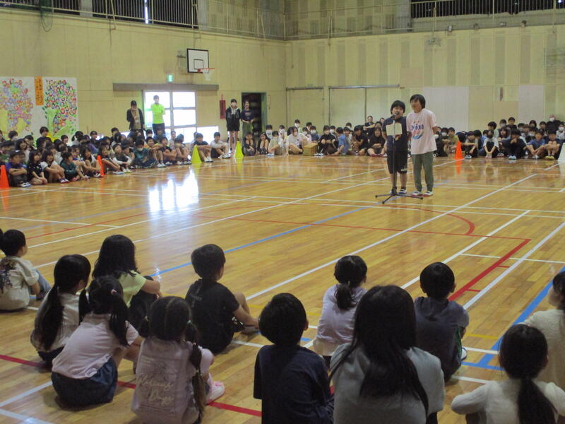 スマイル集会では、生活安全委員会から今月の生活目標「協力して、そうじをしよう」を達成するために、教室や廊下のごみを自分から拾う提案がありました。