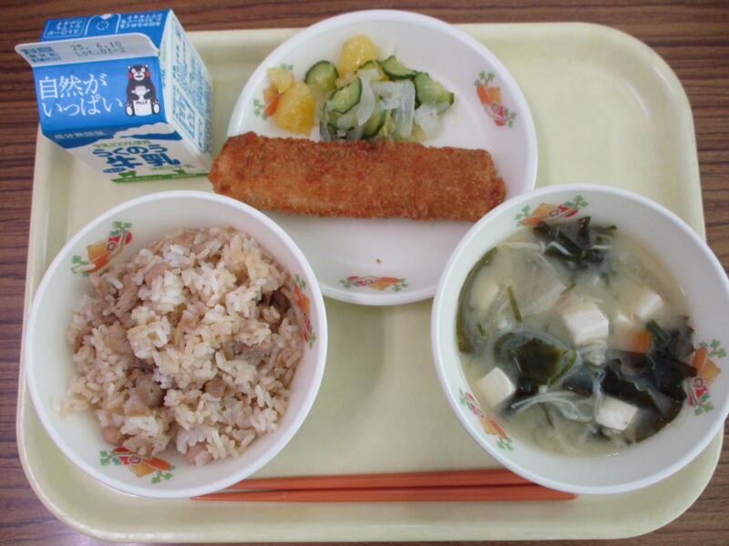 「ふるさとくまさんデー」では、熊本県内の各地域の特産品を使ったメニューが毎月給食で出されます。11月は「宇城地区」で、メニューは、びりんめし、しらたまじる、れんこんサラダ、みかん、牛乳でした。