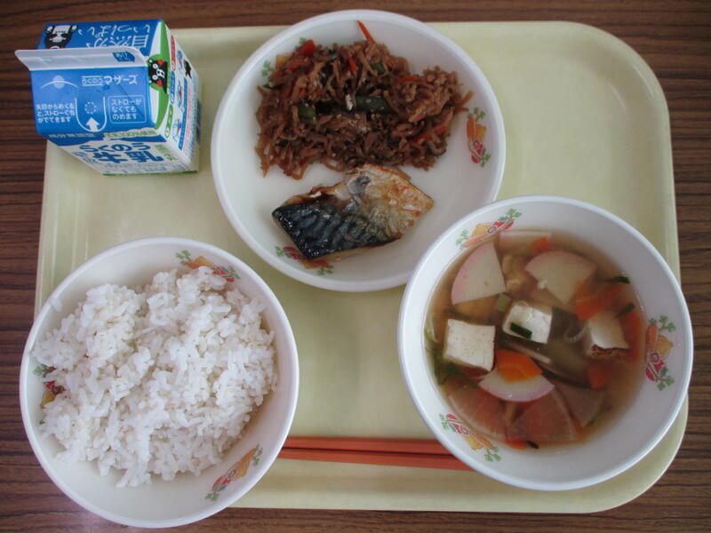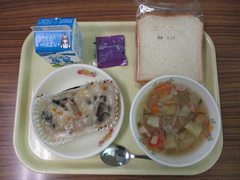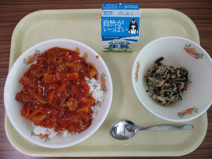 「ふるさとくまさんデー」では、熊本県内の各地域の特産品を使ったメニューが毎月給食で出されます。12月は「八代地区」で、メニューは、ミルクパン、トマトポトフ、ちくわとキャベツのサラダ、牛乳でした。