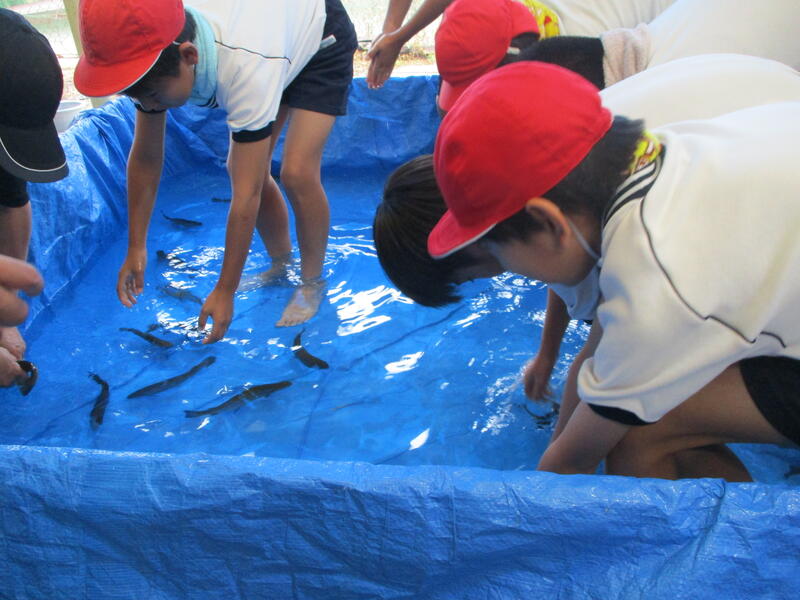 6月18日に田植えを行い、5年生はそれ以降もバケツ稲の管理や生長の観察を続けていました。すくすくと育った稲を収穫しました。地域にお住いの内藤さんをお招きし、稲刈りの方法を説明、実演していただきました。その後、子どもたちも鋸鎌を持ち、稲を刈っていきました。小さかった苗が大きく成長したことを感じていました。