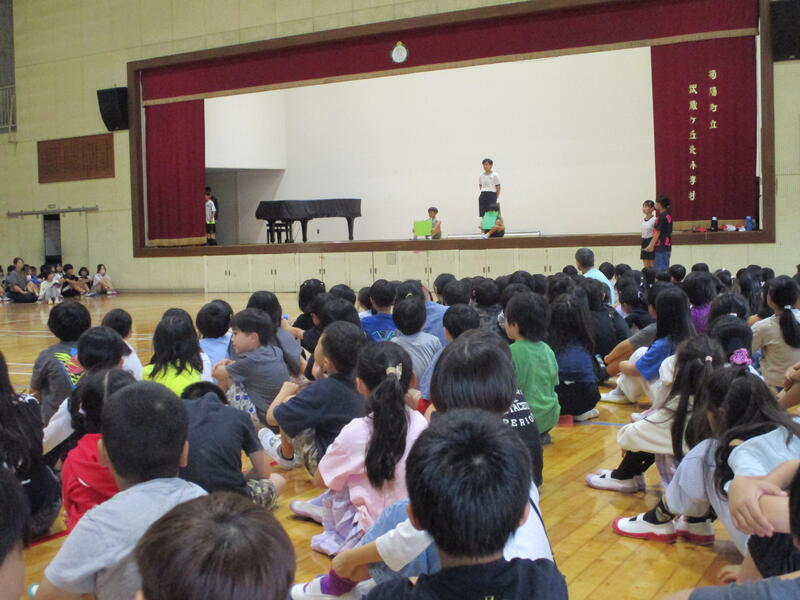 スマイル集会では、生活安全委員会から今月の生活目標「協力して、そうじをしよう」を達成するために、教室や廊下のごみを自分から拾う提案がありました。