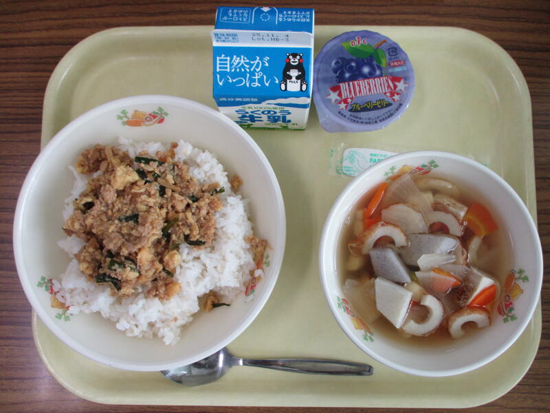 「ふるさとくまさんデー」では、熊本県内の各地域の特産品を使ったメニューが毎月給食で出されます。10月は「上益城地区」で、メニューは、にらひき肉丼、牛乳、いちょう葉汁、ブルーベリーゼリーでした。