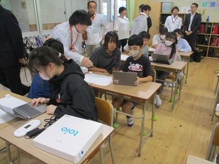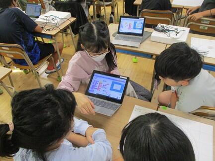 児童のタブレットと「toio(トイオ)」というソフトを使って行うプログラミングを教えていただきました。ブロックを意図した通りに動かすために、動きの順序を考えて、指示を出して操作していきます。初めは操作にもドキドキしていたようですが、慣れるとスムーズに動かせるようになり、どんどん次の課題を進めていました。
