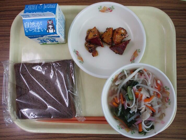 「ふるさとくまさんデー」では、熊本県内の各地域の特産品を使ったメニューが毎月給食で出されます。12月は「八代地区」で、メニューは、ミルクパン、トマトポトフ、ちくわとキャベツのサラダ、牛乳でした。