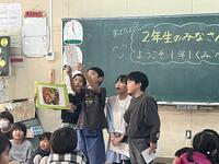 2年生では国語の時間に「ビーバーの大工事」を学習しました。11月21日(木)に、これまで学習したことを1年生に向けて発表しました。画用紙いっぱいに描いたビーバーの絵を見せたり、ビーバーの秘密をクイズにしたり、「ビーバーのダム」という歌を振り付きで元気いっぱい歌ったり、学んだことを堂々と発表することができました。1年生も、ビーバーの秘密に「え~。」と驚いたり、「ビーバーのダム」を一緒に歌って踊ったり、楽しむことができました。また、2年生が立派に発表する姿を、憧れの眼差しで見つめていました。2年生にとっても、1年生の前で発表することで、学びを更に深めることができました。