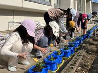 菊陽町の「花いっぱい運動」の一環として、ビオラ、ノースポール、ナデシコの苗をいただきました。11月21日(木)・22日(金)に、いただいた苗を1・2年生が自分の植木鉢に植え替えを行いました。もらった苗をそっとポットから取り出し、根や茎や葉を傷つけないように大事に大事に扱い、植木鉢に掘った穴にそっと植え、根元に優しく土を被せていました。植え替えた後は、自分の苗に「元気に育て!」と水を与えていました。これから冬を迎えますが、しっかりとお世話をし、きれいな花を咲かせてくれることと思います。今後は、PTA緑化委員会、グリーンサポーターの皆様にもご協力いただき、花壇への苗植えを行います。児童、保護者、地域と連携し、武蔵ヶ丘北小を花いっぱいの、心豊かな学校にしていきたいと思います。