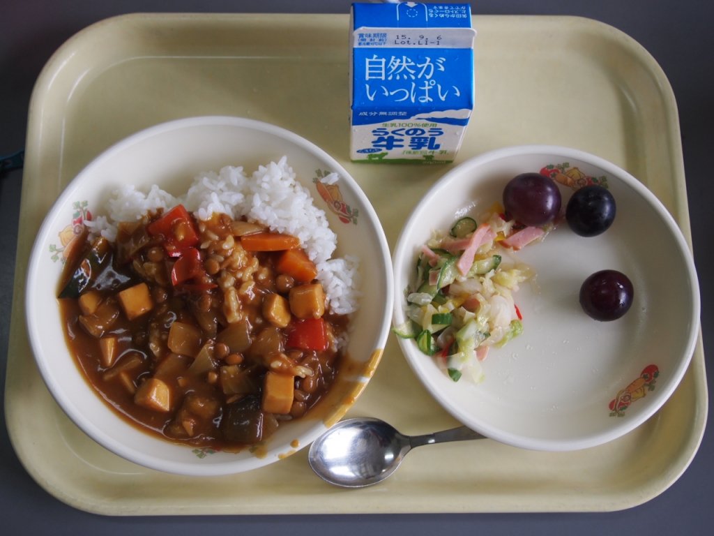 夏野菜の精進カレー 投稿日時 : 2015/08/26 学校サイト管理者 五穀ご飯・夏野菜の精進カレー・サラダ・ぶどう今日はパンの予定でしたが、台風による停電でパンが焼けなかったため、前日の献立に変更になりました。子どもたちは大喜びでした。