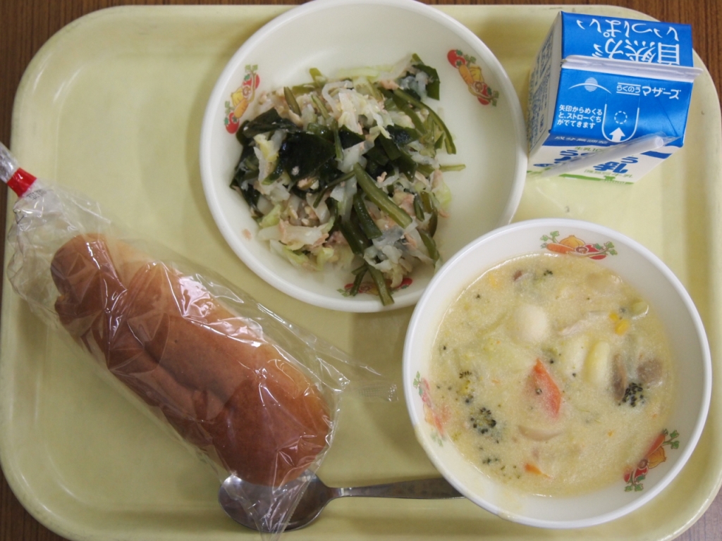 玄米パン・牛乳・うずらの卵のクリーム煮・海草サラダ