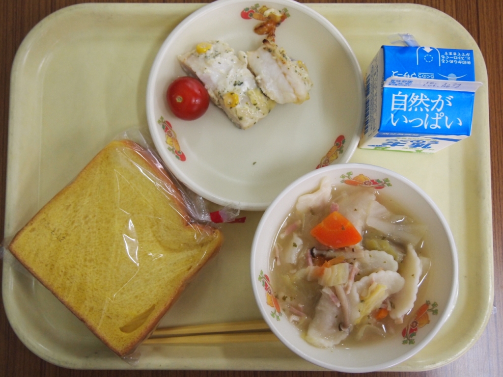 にんじんパン・牛乳・ラビオリスープ・魚のチーズマヨ焼き・ミニトマト