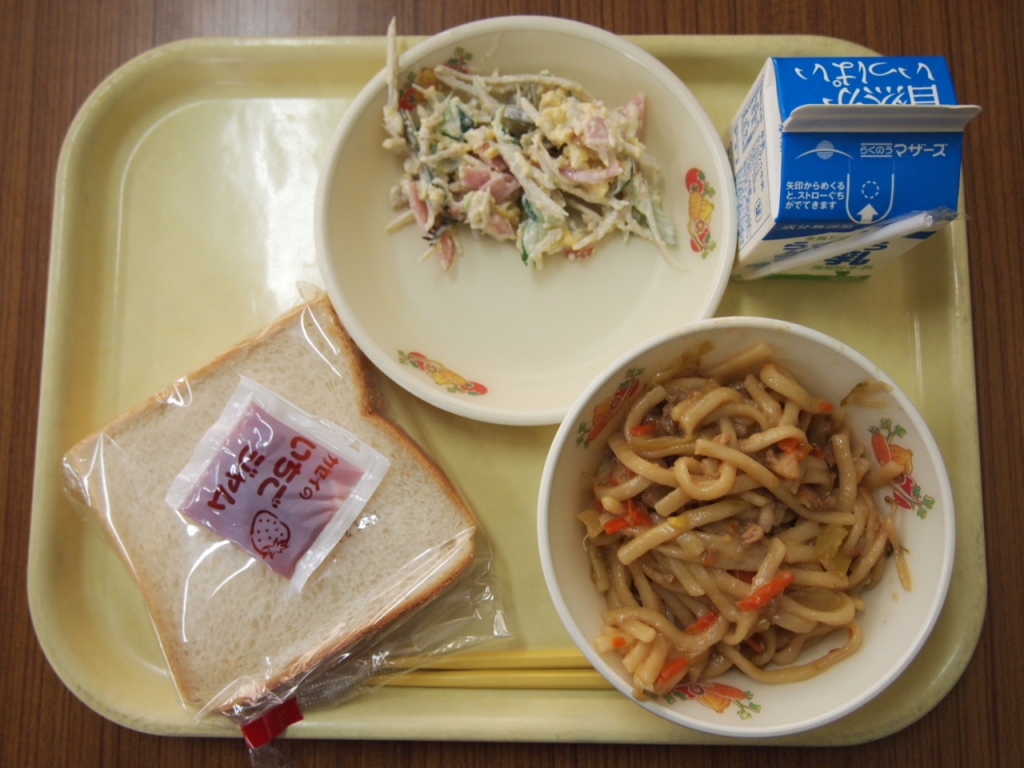 食パン・イチゴジャム・牛乳・やきうどん・ごぼうサラダ