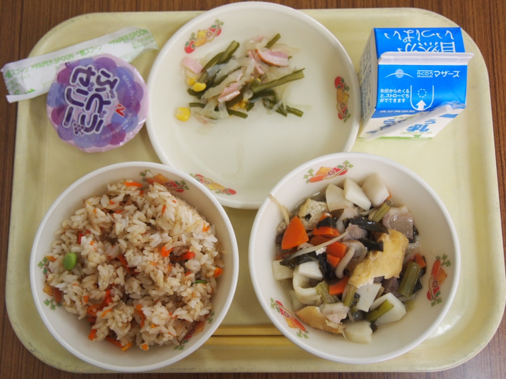にんじゃこご飯・牛乳・たけみつこうなべ・ヤーコンサラダ・ぶどうゼリー