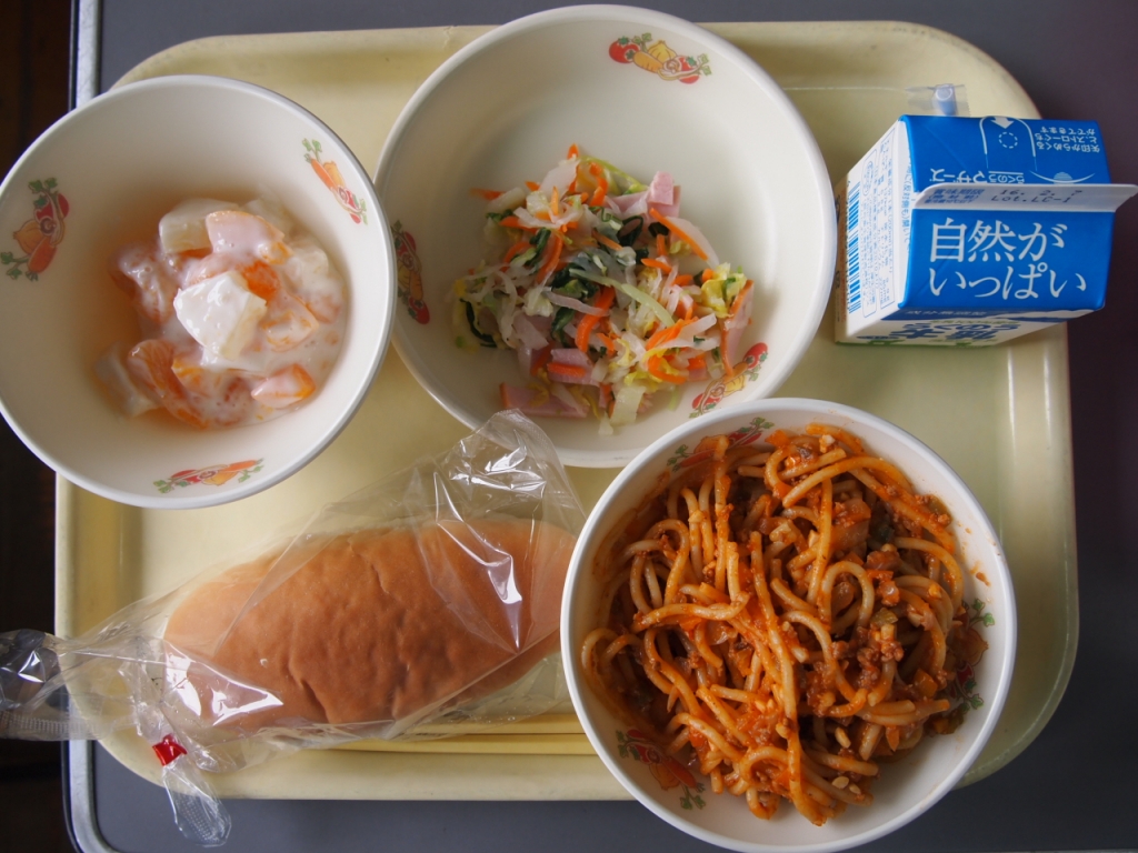 コッペパン・牛乳・トマトミートスパゲティ・白菜サラダ・フルーツヨーグルト