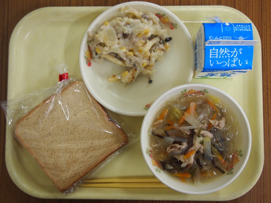 黒糖パン・牛乳・はるさめスープ・グラタン
