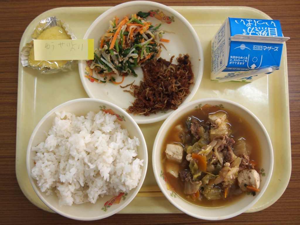 麦ご飯・牛乳・肉豆腐・ごまず和え・切り干し大根のふりかけ