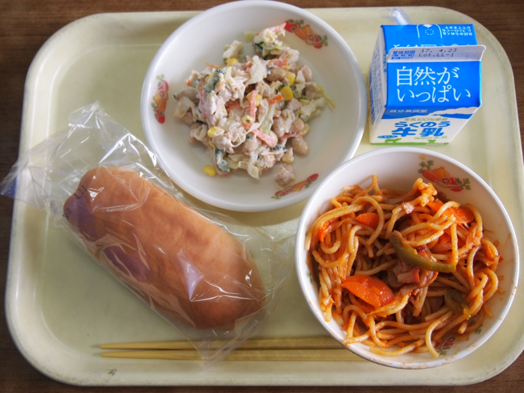 コッペパン・牛乳・スパゲティナポリタン・ツナと大豆のサラダ