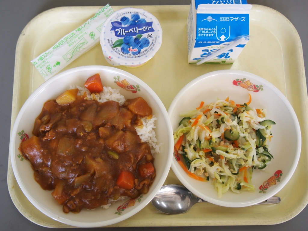 ポークカレー・牛乳・春キャベツのサラダ・ブルーベリーゼリー